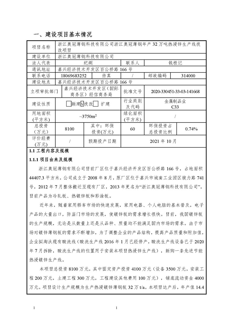 浙江奧冠薄鋼科技有限公司 浙江奧冠薄鋼年產32萬噸熱浸鋅生產線技改項目 環境影響評價公告信息